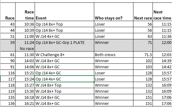 To increase the efficiency of the timetable/boating, one of the crews (winner or loser, it varies) should stay on the water for their next race after the following races (also applies to Challenge8s):